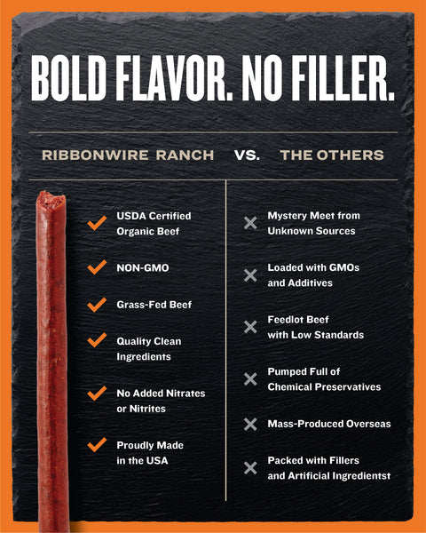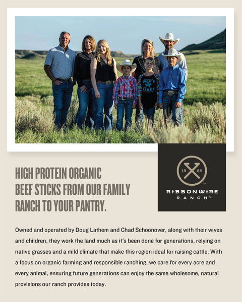 Ribbonwire Ranch Beef Sticks bring together simplicity, tradition, and robust flavor in one satisfying snack. Crafted from beef that’s born, raised, and finished on our family-run ranch in the Texas Panhandle, these sticks reflect a deep commitment to land, animals, and responsible ranching practices. From the beginning, we’ve believed in doing things the right way—no shortcuts, no artificial nonsense. That means no gluten, no MSG, no nitrites or nitrates, and no artificial colors or flavors—just real ingredients you can trust. Perfect for everyday snacking or life on the move, these beef sticks make it easy to stay satisfied wherever your day takes you. Whether you're heading out for a hike, working through a long day, or packing a lunchbox, they’re a practical, flavorful option you can feel good about. Each variety pack features a bold lineup of distinct tastes: the savory Original, the sweet heat of Sweet N’ Spicy, the smoky-sweet blend of Honey BBQ, and the zesty kick of Jalapeño. At Ribbonwire Ranch, we raise every animal with care and oversee every step of the process—from pasture to packaging. With every bite, you’re experiencing more than a snack; you’re enjoying the result of generations of hands-on work, a deep respect for the land, and a genuine love for what we do. Try all four flavors and enjoy the taste of something real.